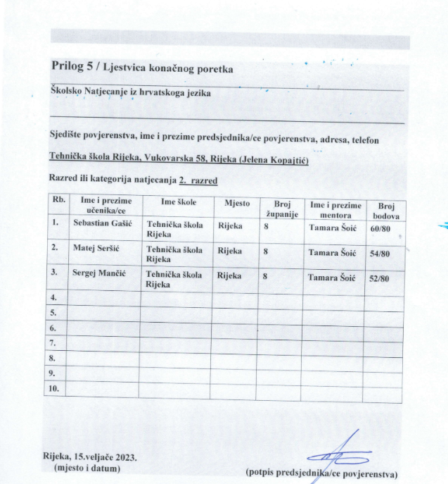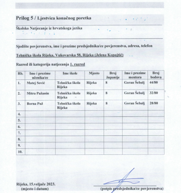 Ljestvica konačnog poretka - Školska razina natjecanja iz Hrvatskoga jezika