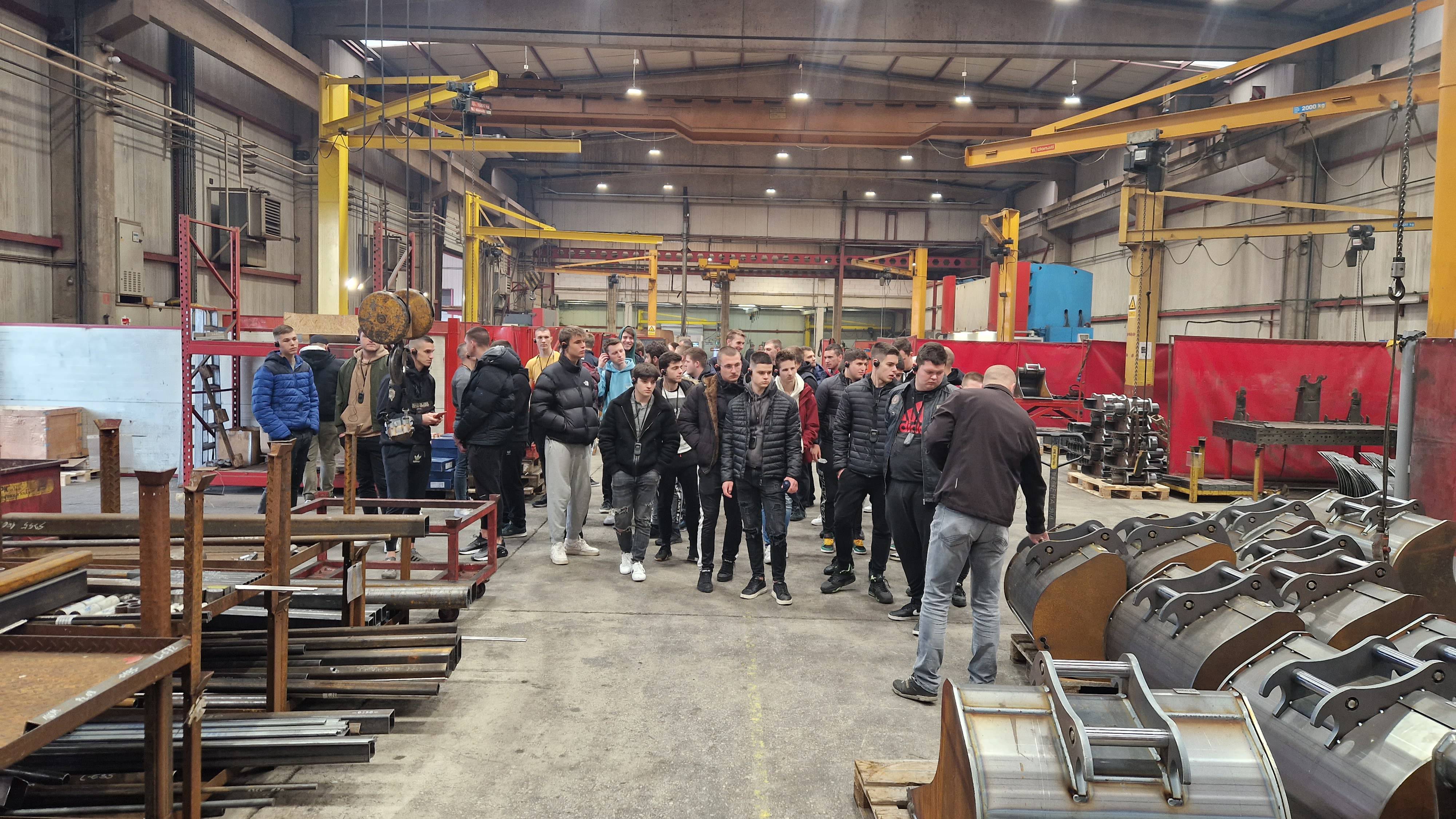 Obilazak je počeo u dijelu pogona za rezanje ravnih limova i njihovo savijanje te se nastavio u progonu za spajanje gotovih poluproizvoda i završno lakiranje prikolica. Na gotove prikolice se vrši montaža potrebnih hidrauličnih nadogradnji prema potrebama budućih kupaca. Posebna atrakcija bila je mogućnost da učenici upravljaju dizalicom na kamionu i radnom košarom za rad na visini, koju su učenici sa oduševljenjem prihvatili.
