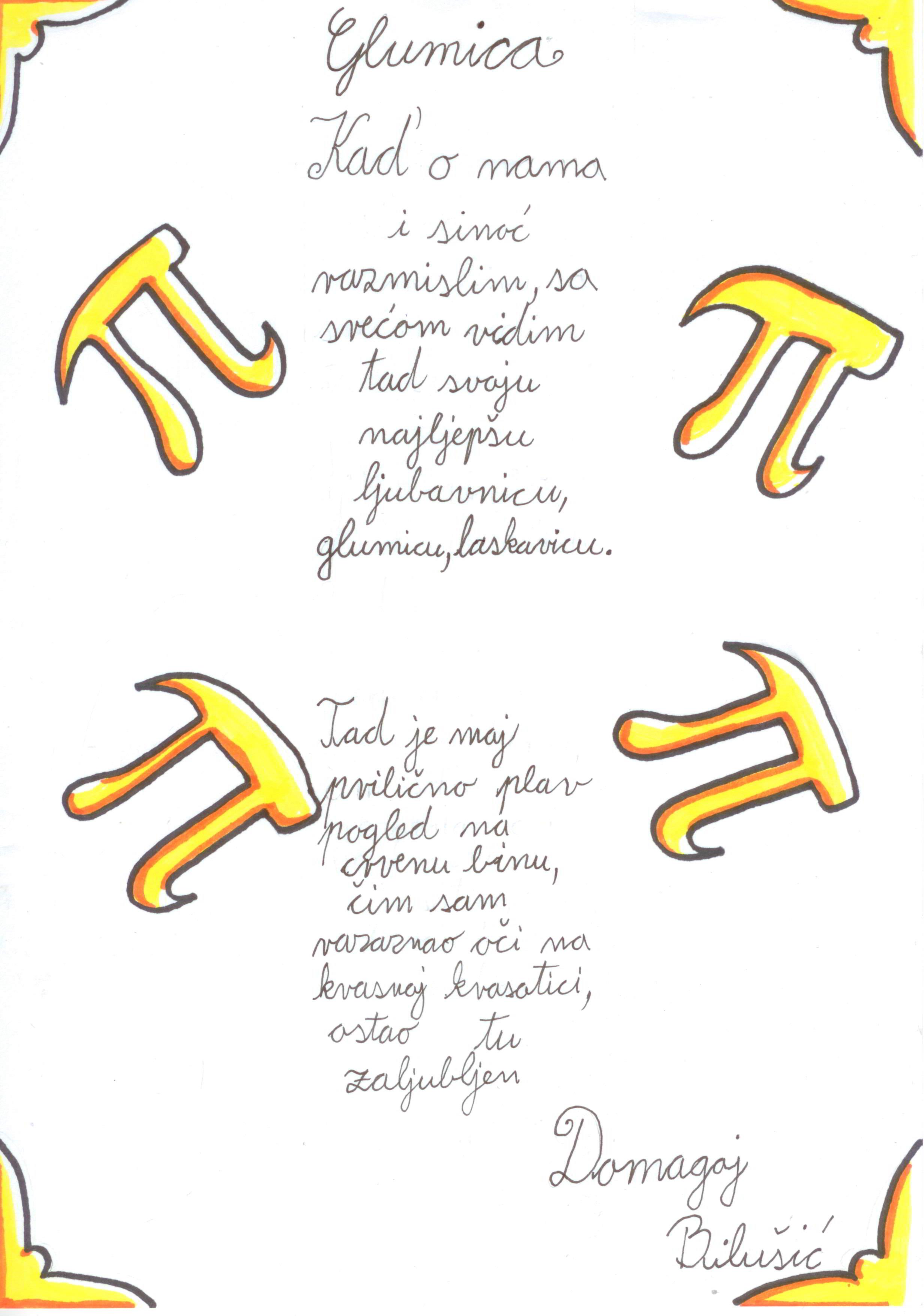 Dana 14. 3. 2016. u našoj školi je obilježen Dan broja π (PI) . Organiziran je natječaj za najbolju π(pi)-smu – pjesmu čije riječi redom imaju onoliko slova kako se izmjenjuju decimale broja π (PI).
